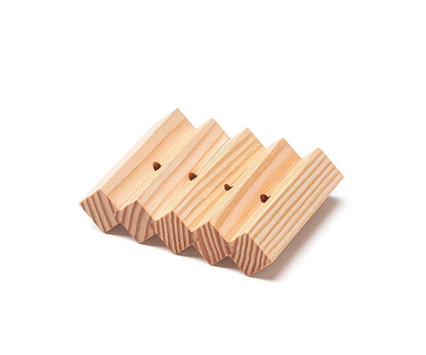 A soap dish made of Douglas Fir offcuts, finished with mineral oil. It measures approximately 105 x 75 x 27 mm.